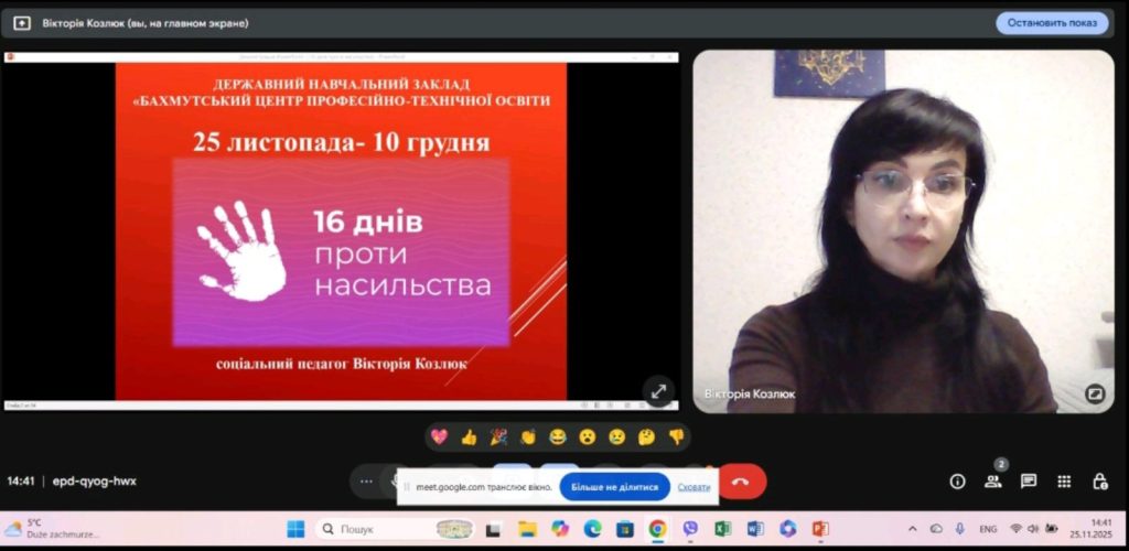 25 листопада 2025 року соціальним педагогом ДНЗ “Бахмутський центр ПТО” проведено Вебінар до міжнародної акції «16 днів проти насильства». Під час заходу розглянули питання: